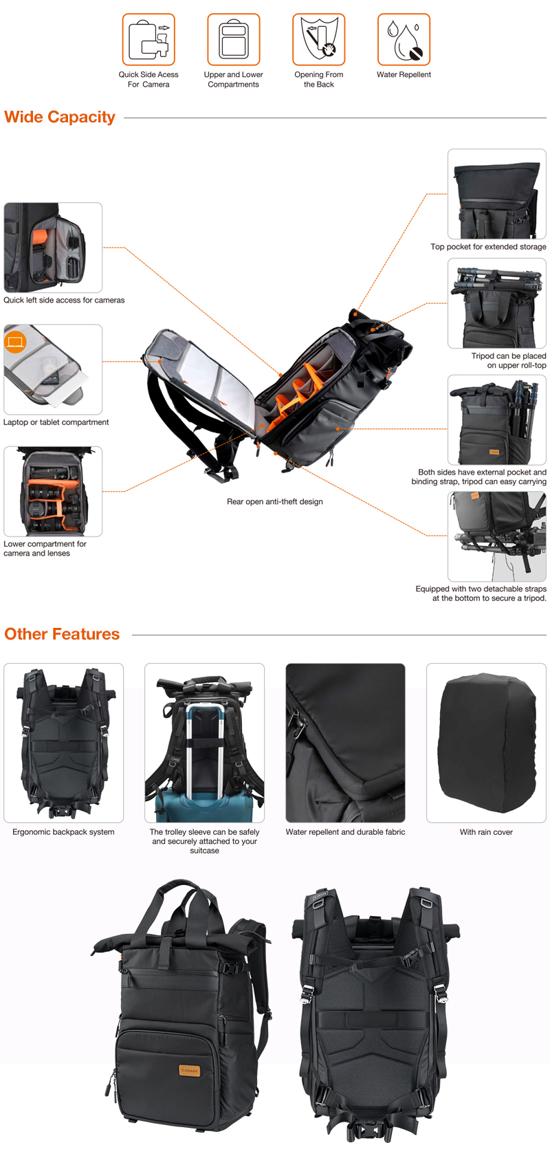 Explore Series camera backpacks are uniquely designed to transport and safeguard laptop, tablet, DSLR Cameras and other accessories. Rear open anti-theft, Upper and lower compartments design can make you better plan the products you need. Side opening gives you quick access to your camera or other essentials without having to unpack your bag. The upper roll-top design is expandable to create extra space. The exterior side pocket can hold a water bottle or small tripod. With water repellent and durable material. The internal camera shockproof divider, which can better protect the equipment from extrusion impact and scratch. Ergonomic backpack system designed to provide more comfortable carrying experiences. The trolley sleeve can be safely and securely attached to your suitcase, it will make your travelling relaxed and easy to go anywhere.