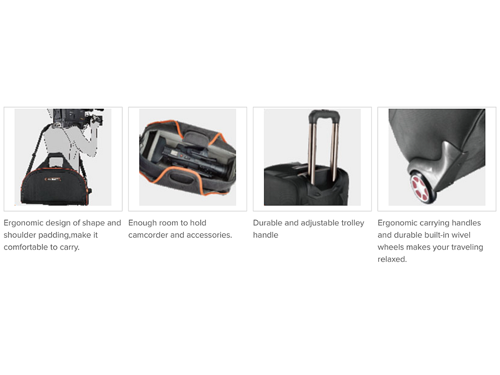 E-image S40 Oscar Trolley for Cameras is uniquely degigned to transport and safeguard today’s compact or other DV camcorders. With water-proof wearable 1680D nylon material. Interior fully padded to safeguard contents. Wide and quick opening for easy access to your contents. Ergonomic carrying handle. Built-in wheeled design S40 Oscar Trolley makes your traveling relaxed and easy to go anywhere.