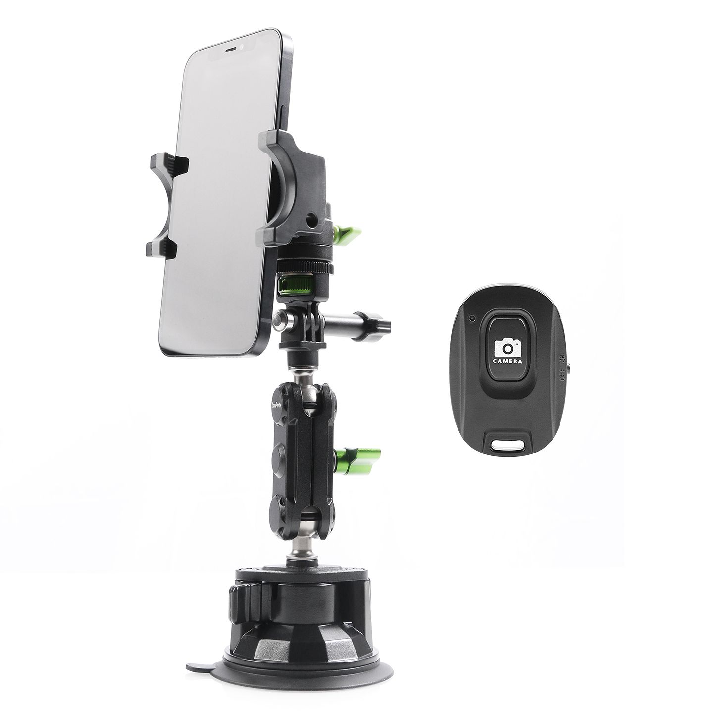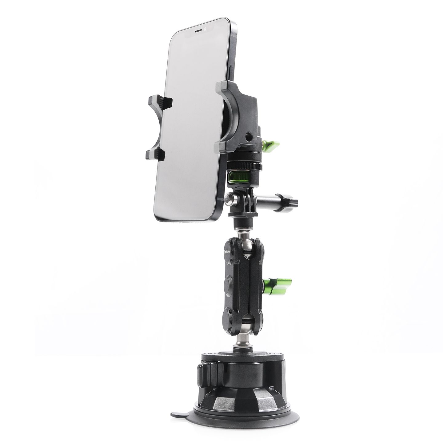The universal suction cup mount we produce provides a perfect solution for users looking for a mount suitable for both phones and action cameras. It features a 3.3-inch one-key lock suction cup base, a dual-ball head arm that offers universal adjustment, a GoPro mount conversion adapter, and a phone clamp.