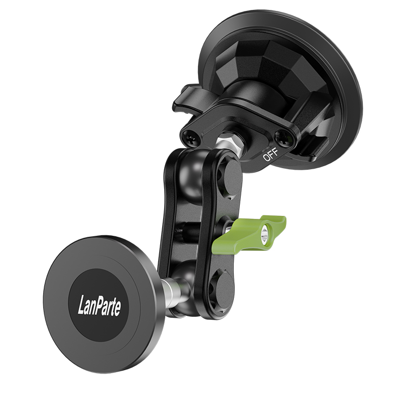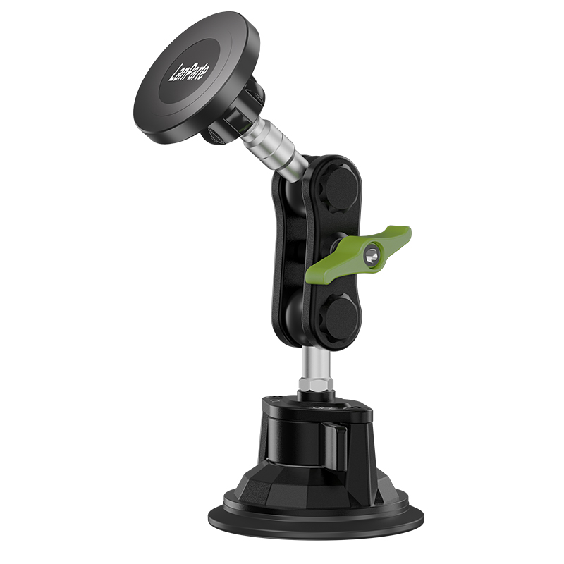 The magnetic phone mount with suction base is a well-crafted device that enables effortless accessibility to your phone while driving, ensuring you stay connected and hands-free. It is equipped with LanParte's one-touch suction cup design, a 3.3-inch suction cup, a magnetic phone holder, and a versatile ball head bracket. The magnetic phone holder securely attaches to phones with wireless charging or Magsafe cases, while ordinary phones can be paired with the included metal magnetic ring. With its adjustable ball head bracket, achieving the perfect angle is a breeze.