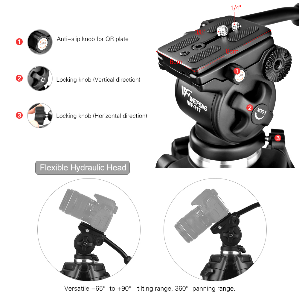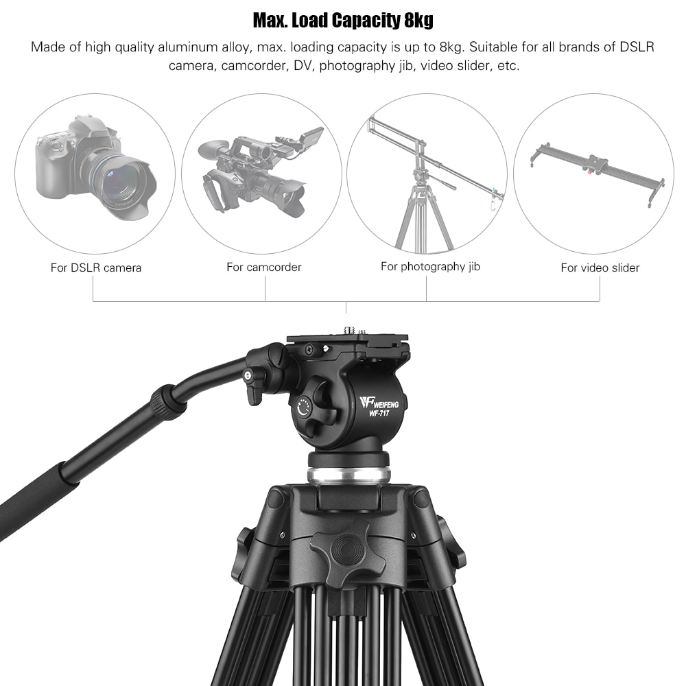 The Weifeng WF-717 1.8m Professional Aluminium Alloy Camera Camcorder Video Tripod with Fluid Hydraulic Head is a heavy duty tripod that is made of high quality aluminium alloy. It has a maximum loading capacity of up to 8kg and is well suited for all brands of camcorders, DSLRs, DV, photography jibs, and video sliders within 8kg.